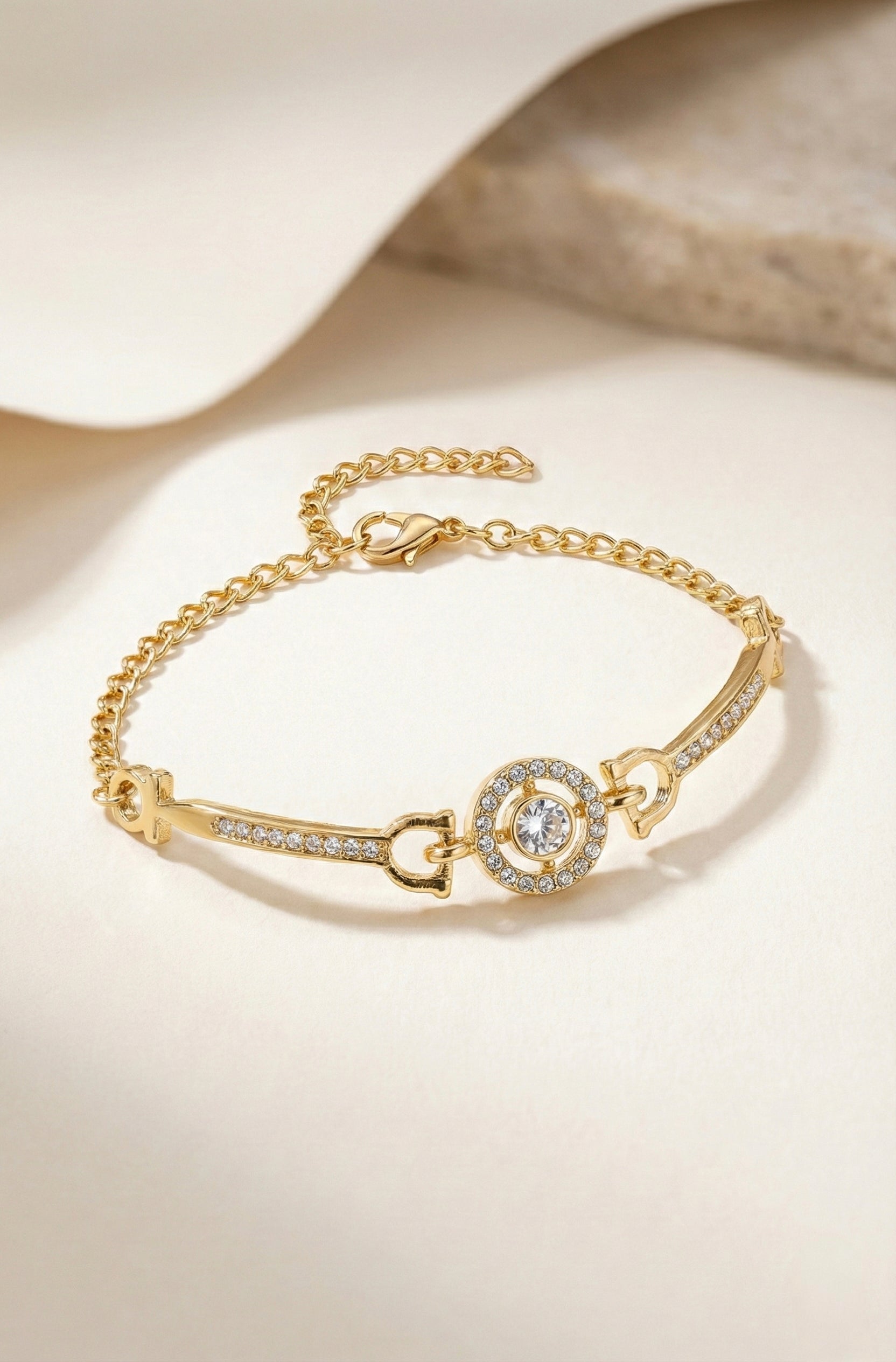The adjustable chain ensures a secure, comfortable fit for all wrist sizes — whether worn alone for minimal glamour or stacked with bangles for a statement look.